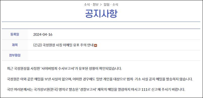 지난달 국정원을 사칭한 피싱 메일이 발견되어 국정원 공지사항을 통해 안내가 되었으나 해당 피싱 메일이 지속적으로 유포되고 있는 것으로 확인되어 주의가 필요합니다.