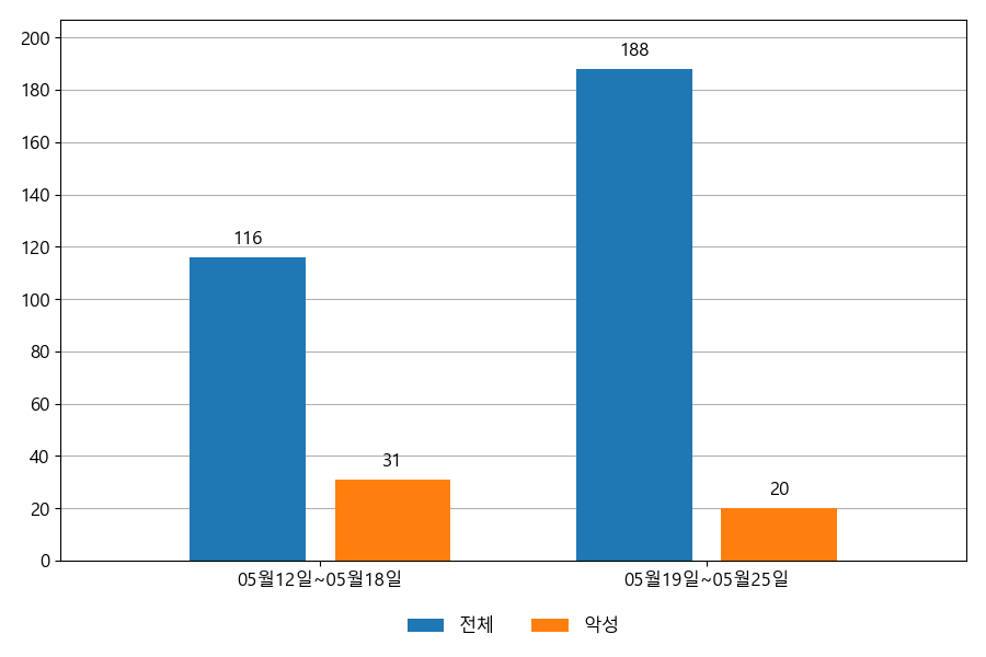 ESRC에서는 자체 운영 중인 이메일 모니터링 시스템의 데이터를 통해 이메일 중심의 공격이 어떻게 이루어지고 있는지 공유하고 있습니다. 다음은 05월 19일~05월 25일까지의 주간 통계 정보입니다.