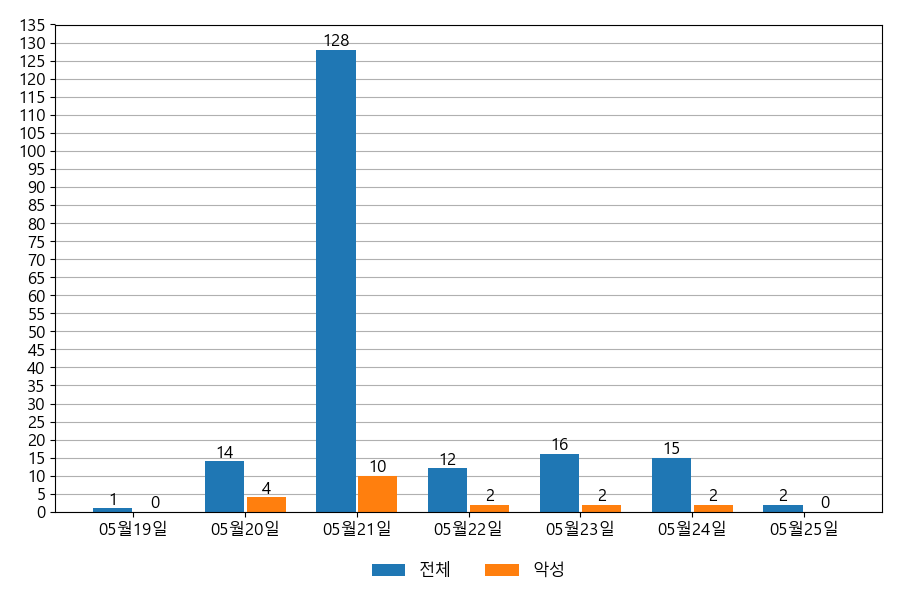 일일 유입량은 하루 최저 1건(악성 2건)에서 최대 128건(악성 10건)으로 일별 편차를 확인할 수 있습니다.