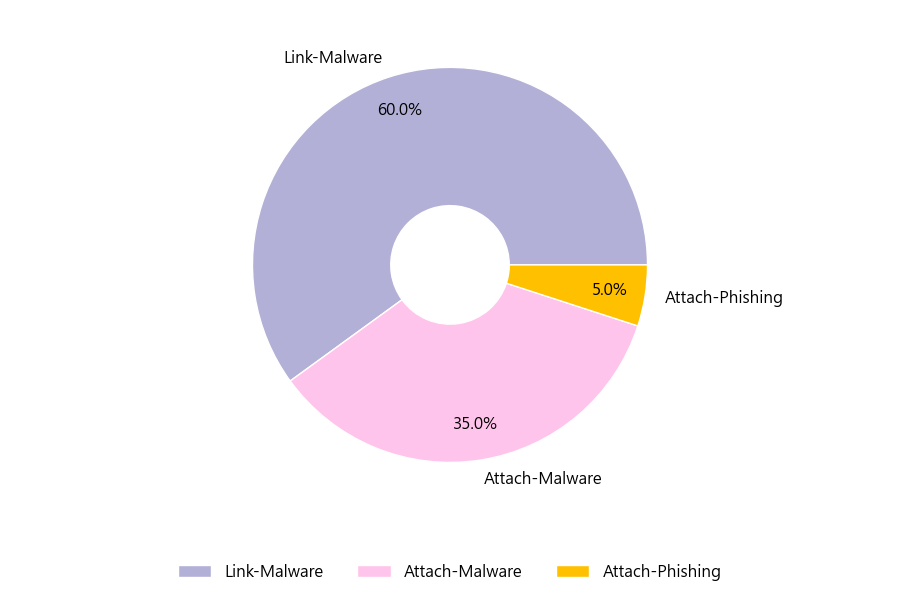 악성 이메일을 유형별로 살펴보면 20건 중 Link-Malware형이 60.0%로 가장 많았고 뒤이어 Attach-Malware형이 35.0%를 나타냈습니다.