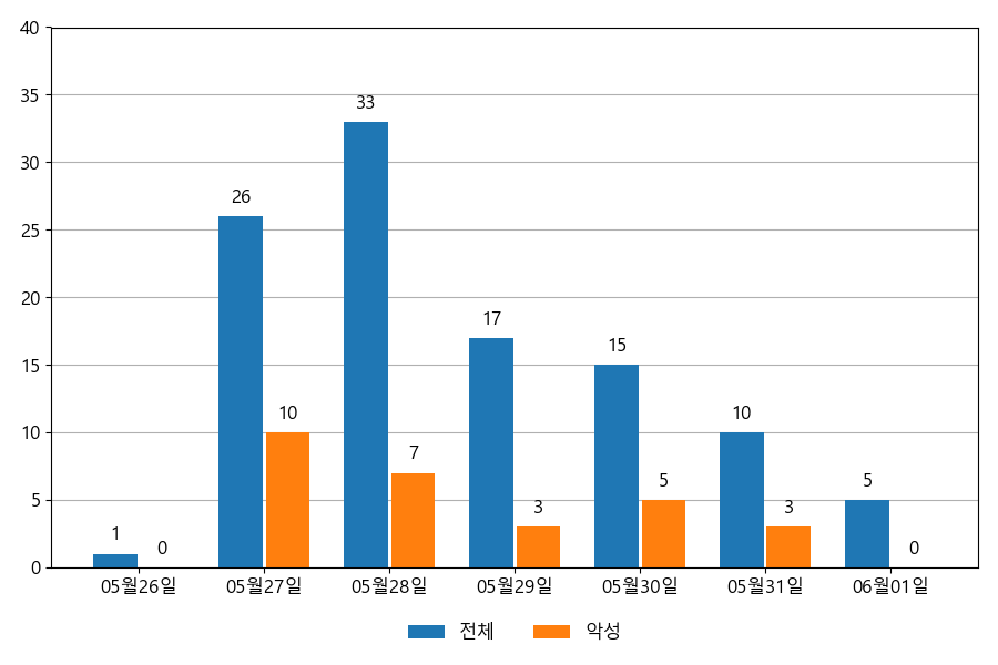 일일 유입량은 하루 최저 1건(악성 3건)에서 최대 33건(악성 10건)으로 일별 편차를 확인할 수 있습니다.
