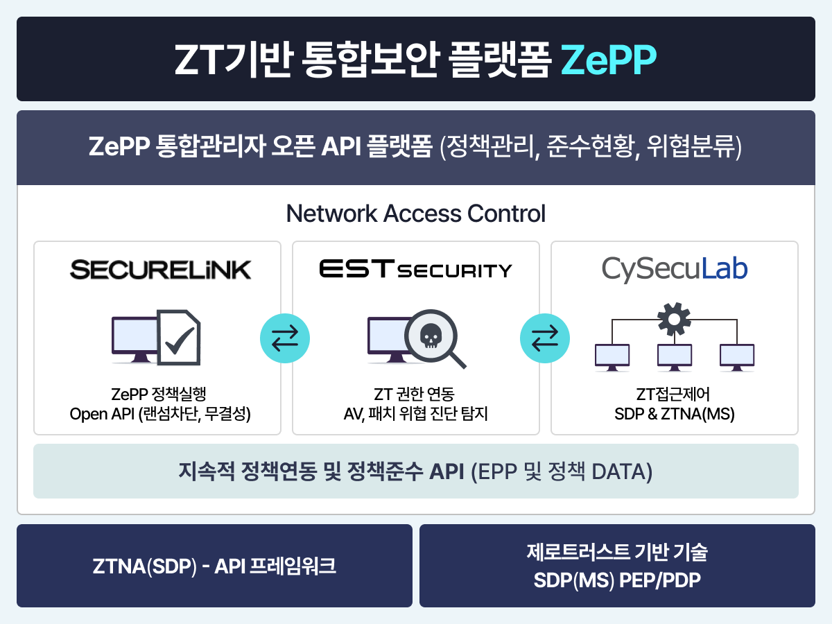 이스트시큐리티는 ‘시큐어링크’, KAIST 교원 창업 기업인 ‘사이시큐연구소(CySecuLab)’ 와 함께 컨소시엄을 구성하여 제로트러스트 기반 엔드포인트 통합보안 플랫폼(Zero Trust Endpoint Protection Platform, 이하 ZePP)을 개발하게 됩니다.