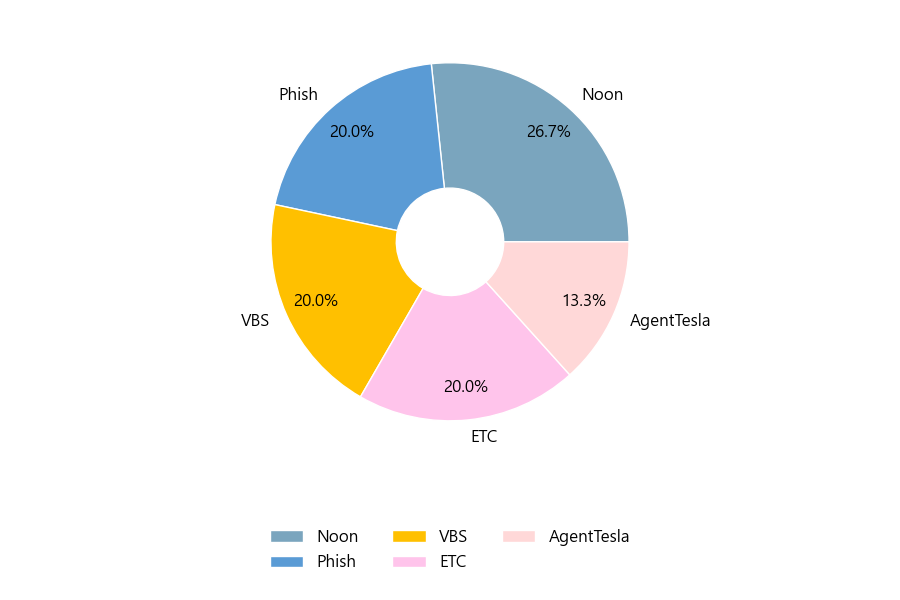 첨부파일은 ‘Noon’형태가 26.7%로 제일 큰 비중을 차지했고 뒤이어 ‘Phish’, ‘VBS’가 각각 20.0%, 20.0%의 비중을 차지했습니다.