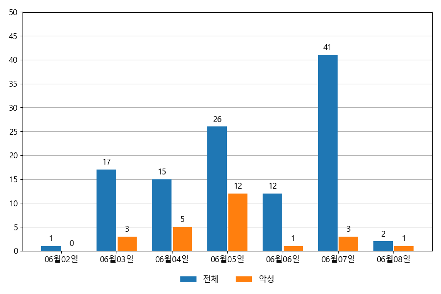 일일 유입량은 하루 최저 1건(악성 1건)에서 최대 41건(악성 12건)으로 일별 편차를 확인할 수 있습니다.