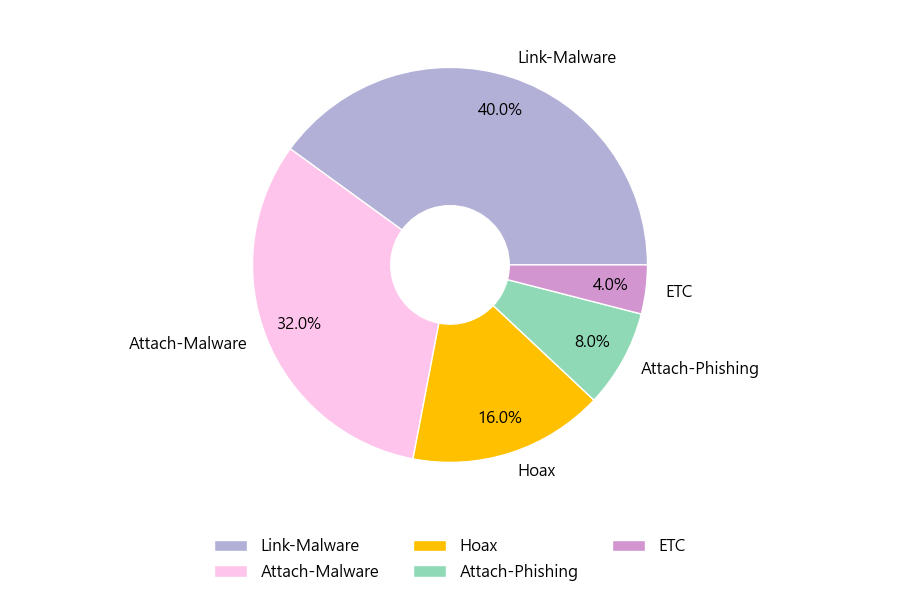 악성 이메일을 유형별로 살펴보면 25건 중 Link-Malware형이 40.0%로 가장 많았고 뒤이어 Attach-Malware형이 32.0%를 나타냈습니다.