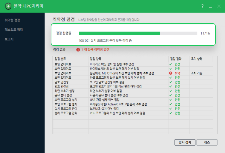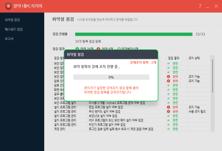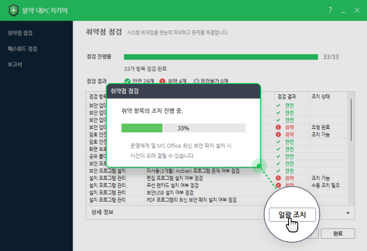 취약하다고 진단받은 항목을 안전하게 만들기 위해 [자동 조치] 또는 상세한 [수동 조치 안내]를 통해 취약점을 조치할 수 있도록 유도하여, 사용자 스스로 PC 관리 수준을 개선하도록 합니다. 이 때 취약점들을 일괄로 자동 조치할 수 있도록 하는 [일괄 조치] 기능도 있습니다.