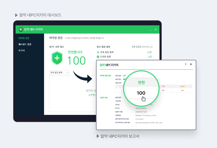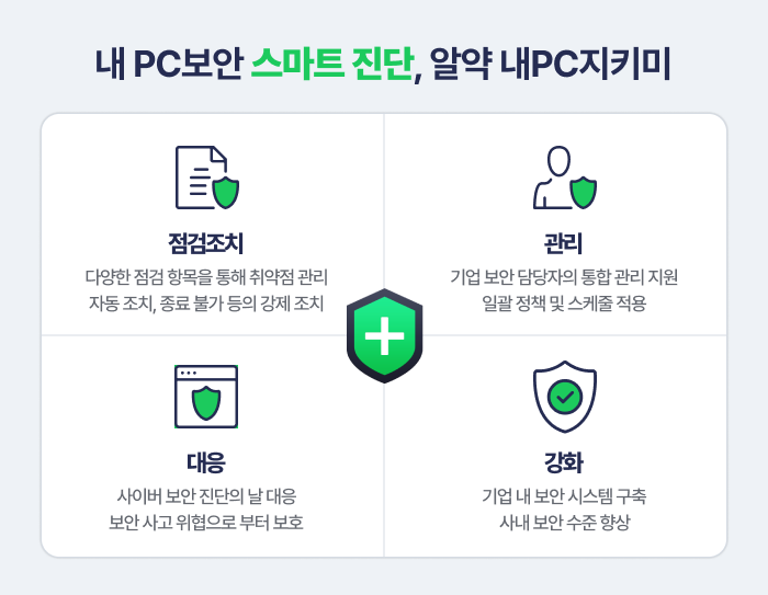커스텀 점검부터 취약점 조치, 점검 결과 관리까지 원스탑(One-stop)으로 가능한 알약 내PC지키미를 도입하여 안전한 보안 상태를 유지하고, 직원들의 보안 의식을 제고해보시길 추천해드립니다.