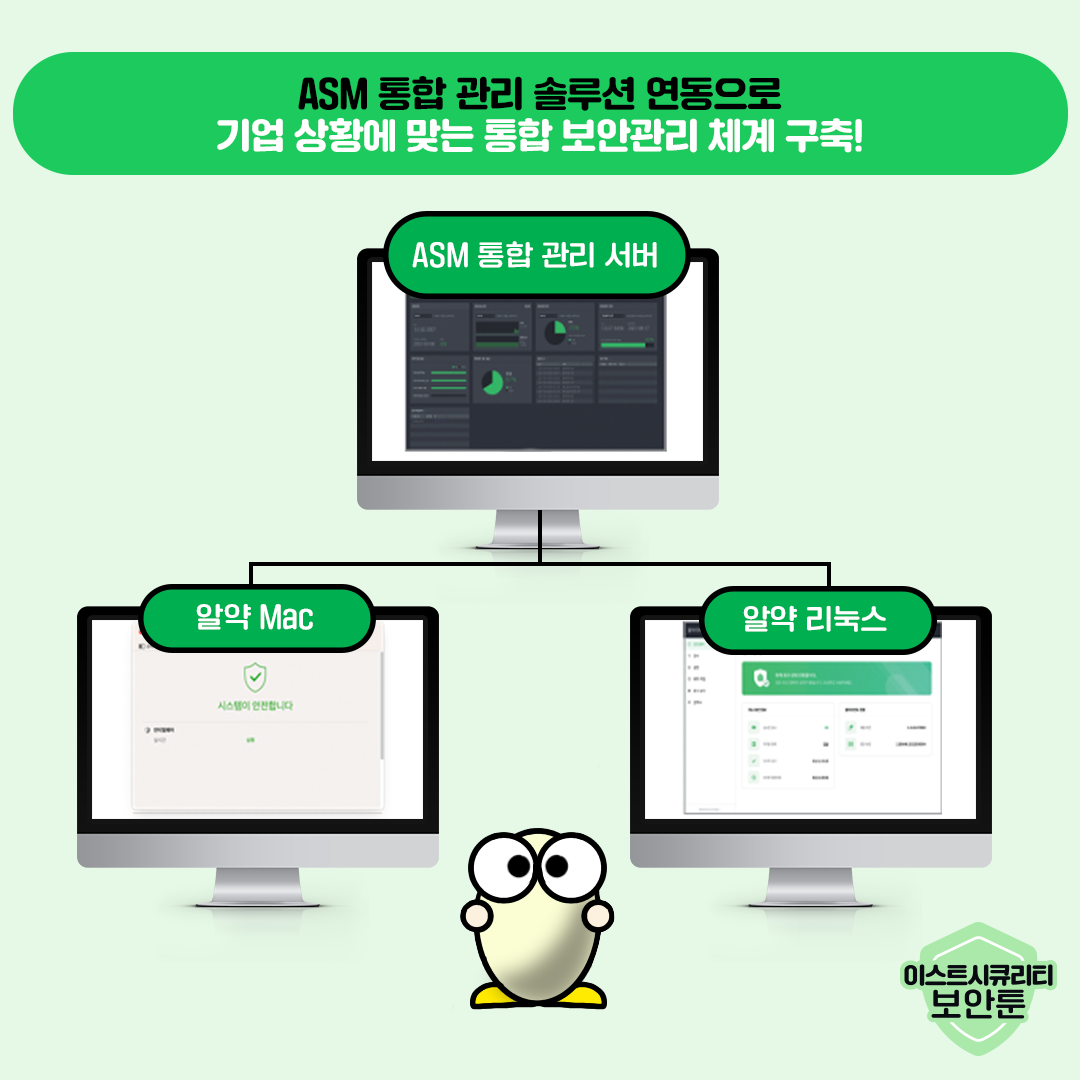 맥OS와 리눅스 사용이 증가하면서 악성공격의 표적이 되어 악성코드 등의 위협이 늘어나고 있지만, 아직까지 윈도우에 비해 보안 솔루션이나 정책적인 제도가 미흡한 경우가 많습니다. 알약 Mac, 알약 리눅스를 ASM(ALYAC Security Manager) 통합 관리 솔루션과 연동하여 사내 보안 정책에 맞춘 업데이트 및 스케줄링 설정으로, 기업의 상황에 맞는 엔드포인트 통합 솔루션 라인을 구축할 수 있습니다.