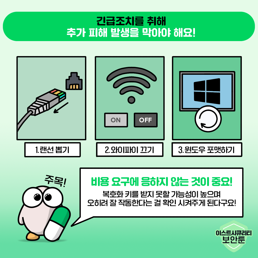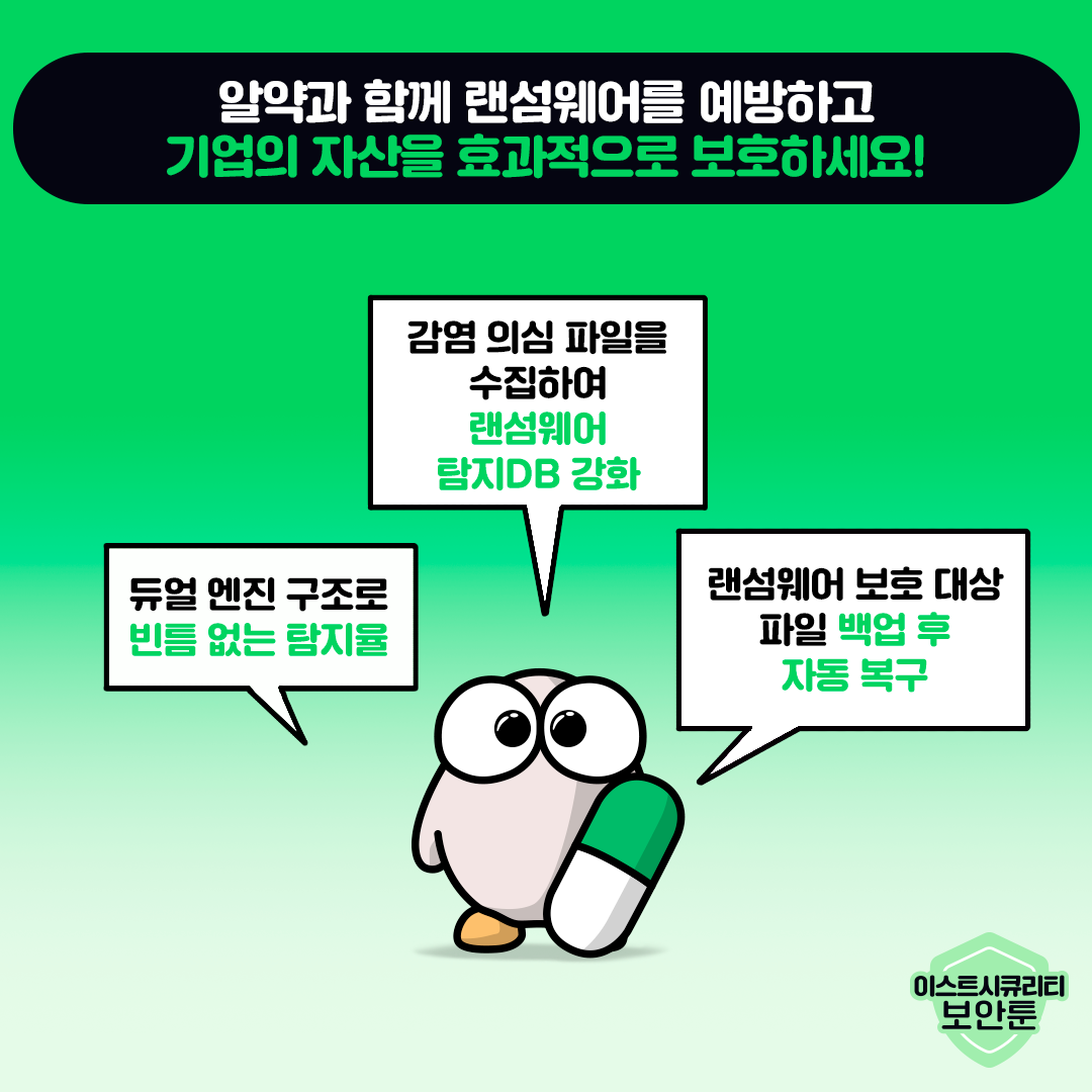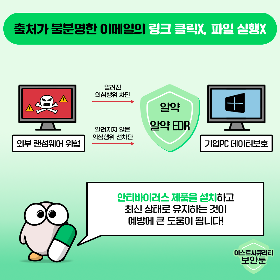 입사지원서로 위장한 랜섬웨어 파일이 끊임없이 유포되고 있습니다. 출처가 불분명한 첨부파일을 다운로드하거나, 실행하지 않는 것이 가장 중요하며, 안티바이러스 제품을 설치하고 최신 상태로 유지하는 것 또한 랜섬웨어 예방에 큰 도움이 될 수 있습니다. 알약과 함께 랜섬웨어로부터 기업PC의 데이터를 효과적으로 보호해 보세요!