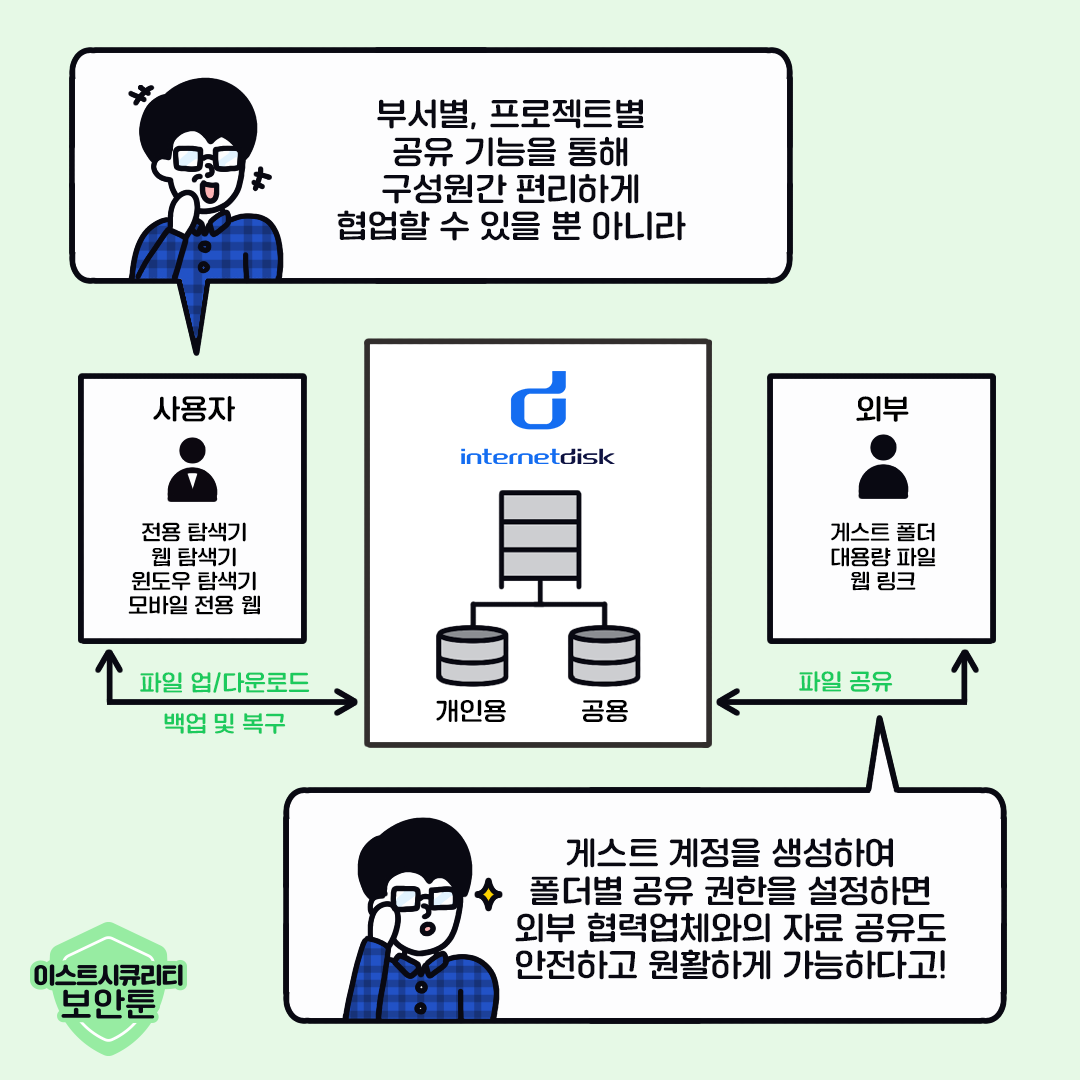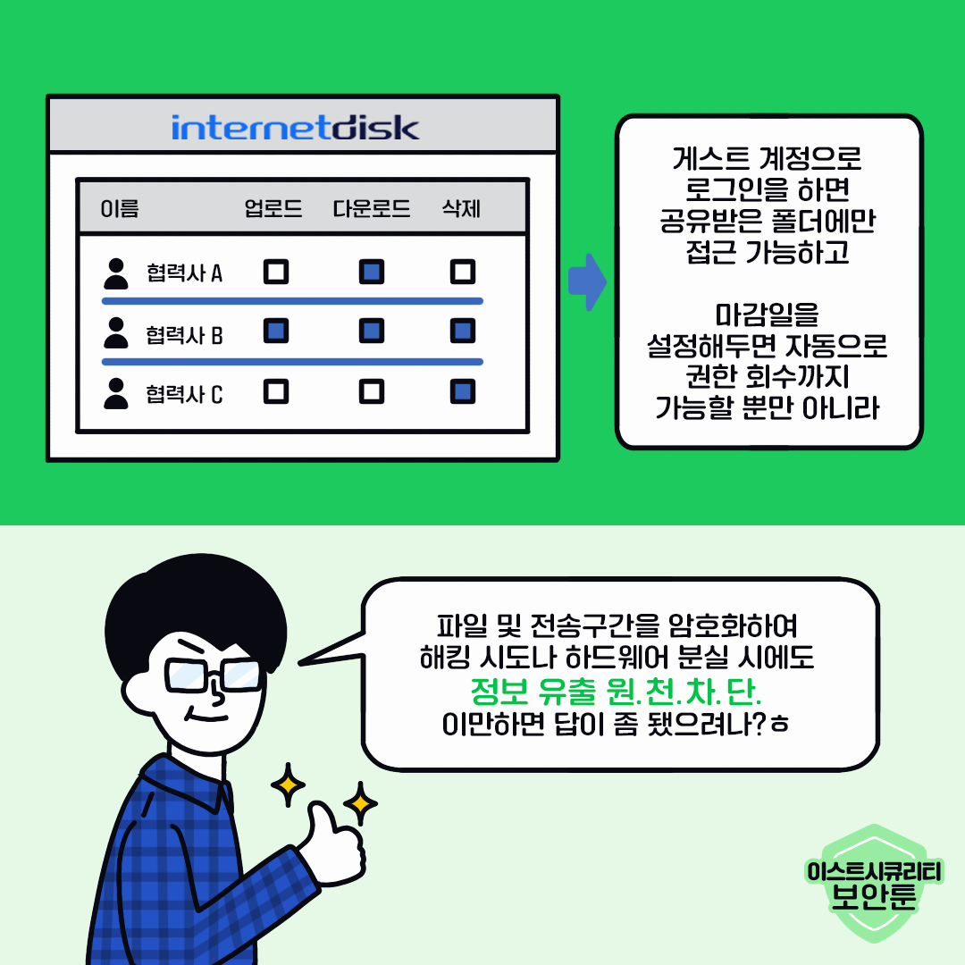 협력업체에 파일을 공유해줘야 하는데, 회사 기밀 문서가 포함되어 있어서 괜히 불안하고 걱정된다면? 안전하고 편리한 협업이 가능한 인터넷디스크를 도입해보세요! 부서별, 프로젝트 별 공유 기능을 통해 구성원간 편리하게 협업할 수 있습니다.