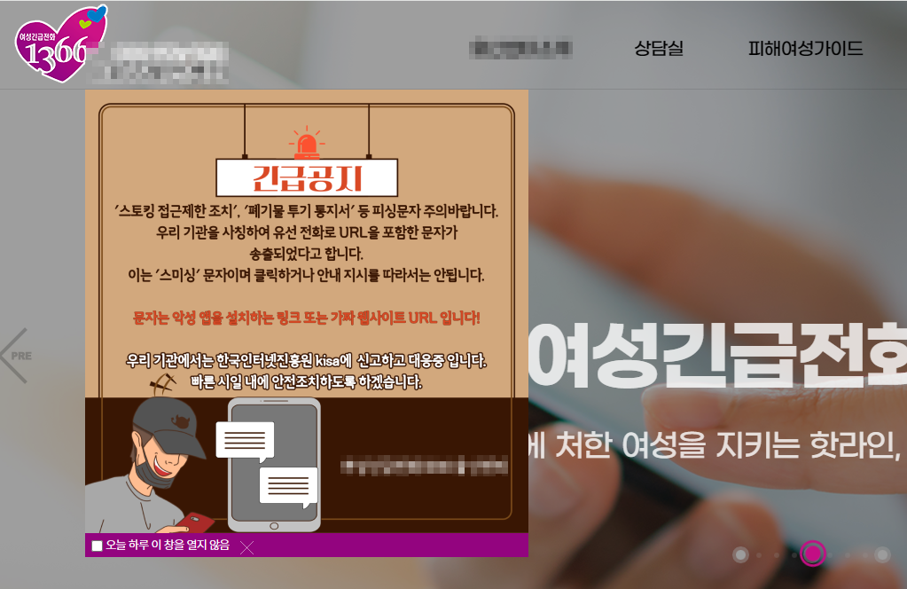 여성긴급전화1366**여성센터(***-***-8555) 사칭 스미싱