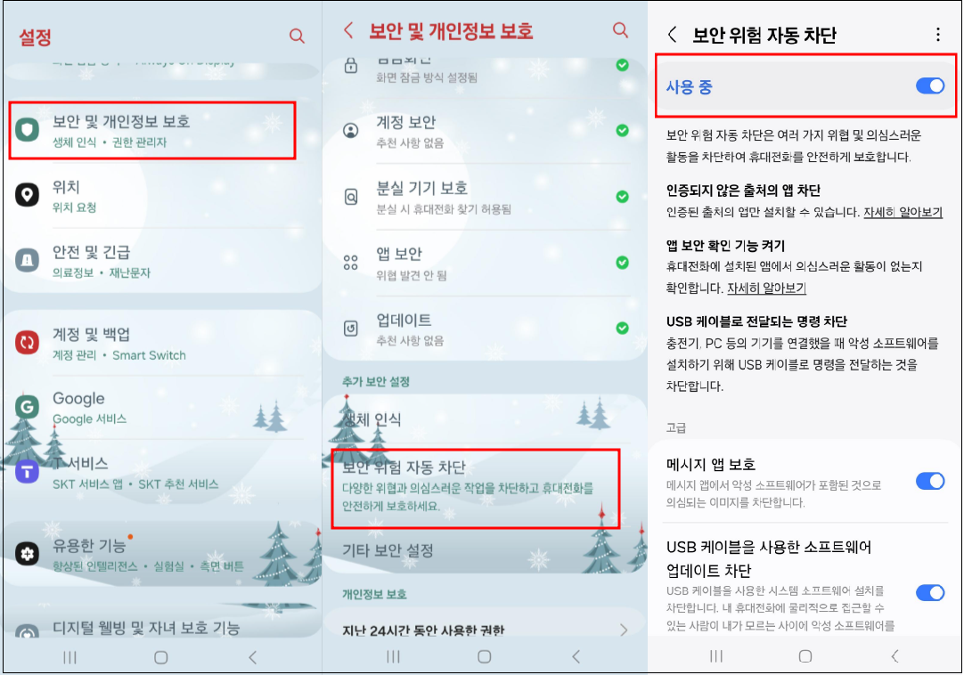 또한 스미싱으로 전파되는 악성 앱은 대부분 안드로이드 공식마켓에 업로드 된 앱이 아니므로 출처가 불분명한 앱이 설치되지 않도록 휴대폰 기기 내 보안 설정을 확인하시어 아래와 같이 차단설정 진행을 권해드립니다.