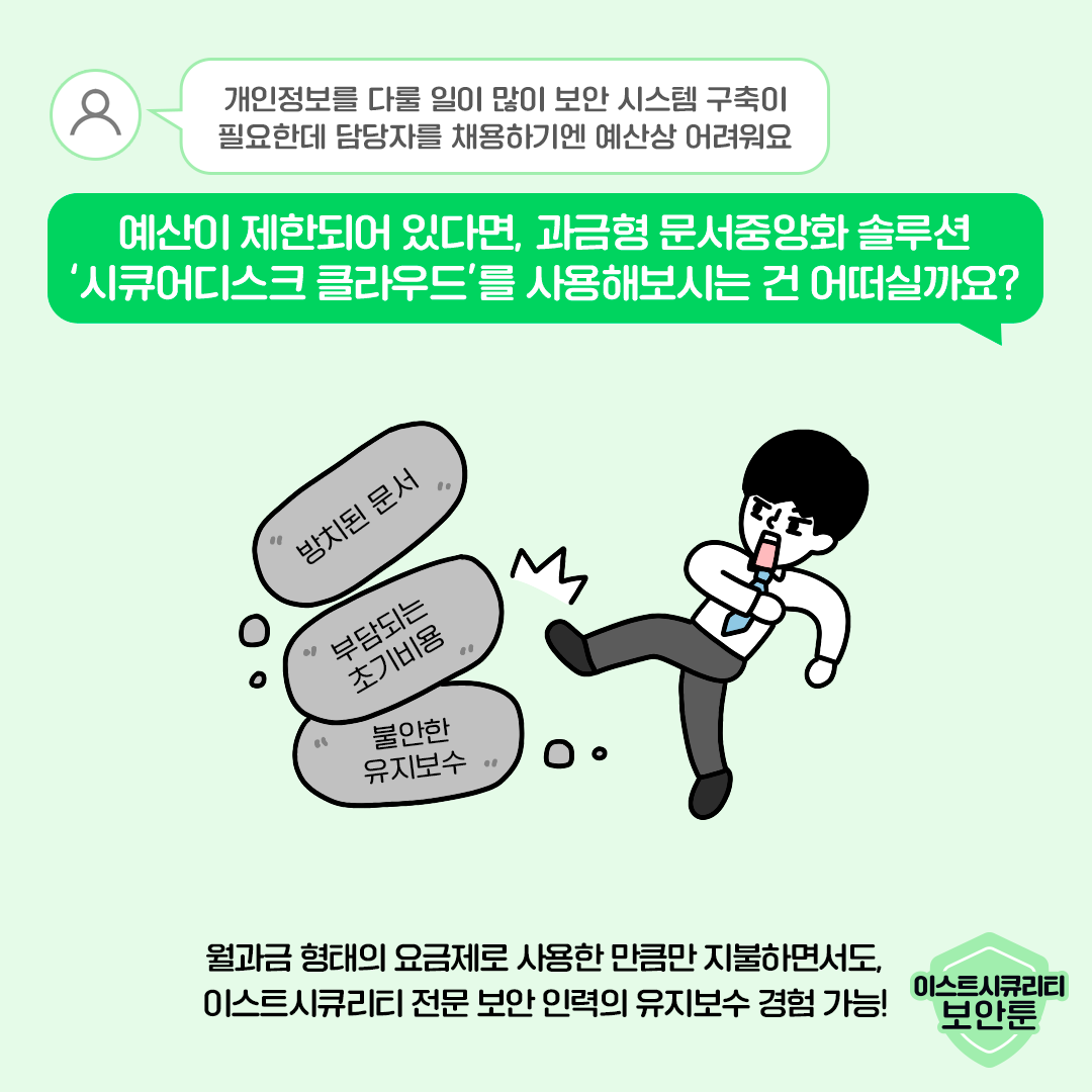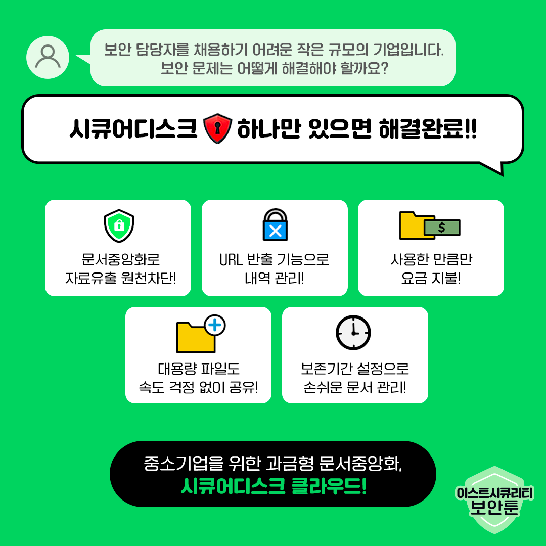 보안 담당자를 채용하기 어려운 작은 규모의 기업들은 보안 문제를 어떻게 해결할까요? 월과금 형태의 요금제로 사용한 만큼만 지불하면서도 보안 전문 인력의 유지보수를 제공하는 시큐어디스크 클라우드로 그 해결책을 알아보세요.
