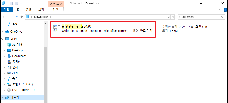 검색된 ‘e_Statement93430’ 파일은 바로가기(.lnk) 파일로, 동일한 원격서버에 위치한 배치파일을 가리키고 있습니다. 만약 사용자가 해당 바로가기 파일을 자신의 로컬PC에 다운로드 된 파일로 오인하여 클릭하게 되면 배치파일이 실행되면서 추가적인 공격으로 이어질 수 있습니다.