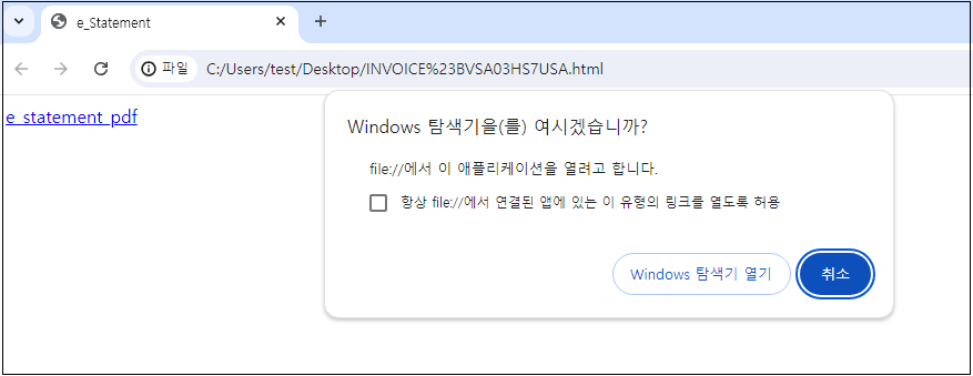 리디렉션 된 후에는 윈도우 검색 프로토콜을 사용하기 위한 윈도우 탐색기 실행 허용 여부를 묻는 메시지 창이 발생하고, 탐색기 사용을 허용하게 되면 윈도우 검색 프로토콜을 통해 공격자의 원격서버에서 파일 검색 작업을 수행하게 됩니다.