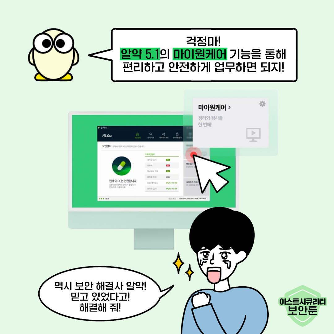 평소 백신을 사용하면서 검사 말고도 업데이트와 PC 정리까지, 한 번에 했으면 좋겠다고 생각해 보신 적 있으신가요? 이스트시큐리티 알약 5.1의 마이원케어는 클릭 한 번으로 편리하고 안전한 업무환경을 제공하고 있습니다. 더 자세한 상담이 필요하시다면 아래 링크에서 견적 문의를 남겨보세요! 📨