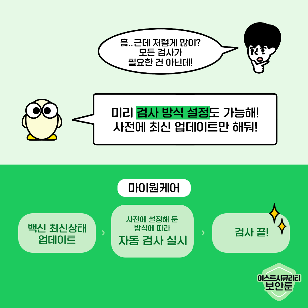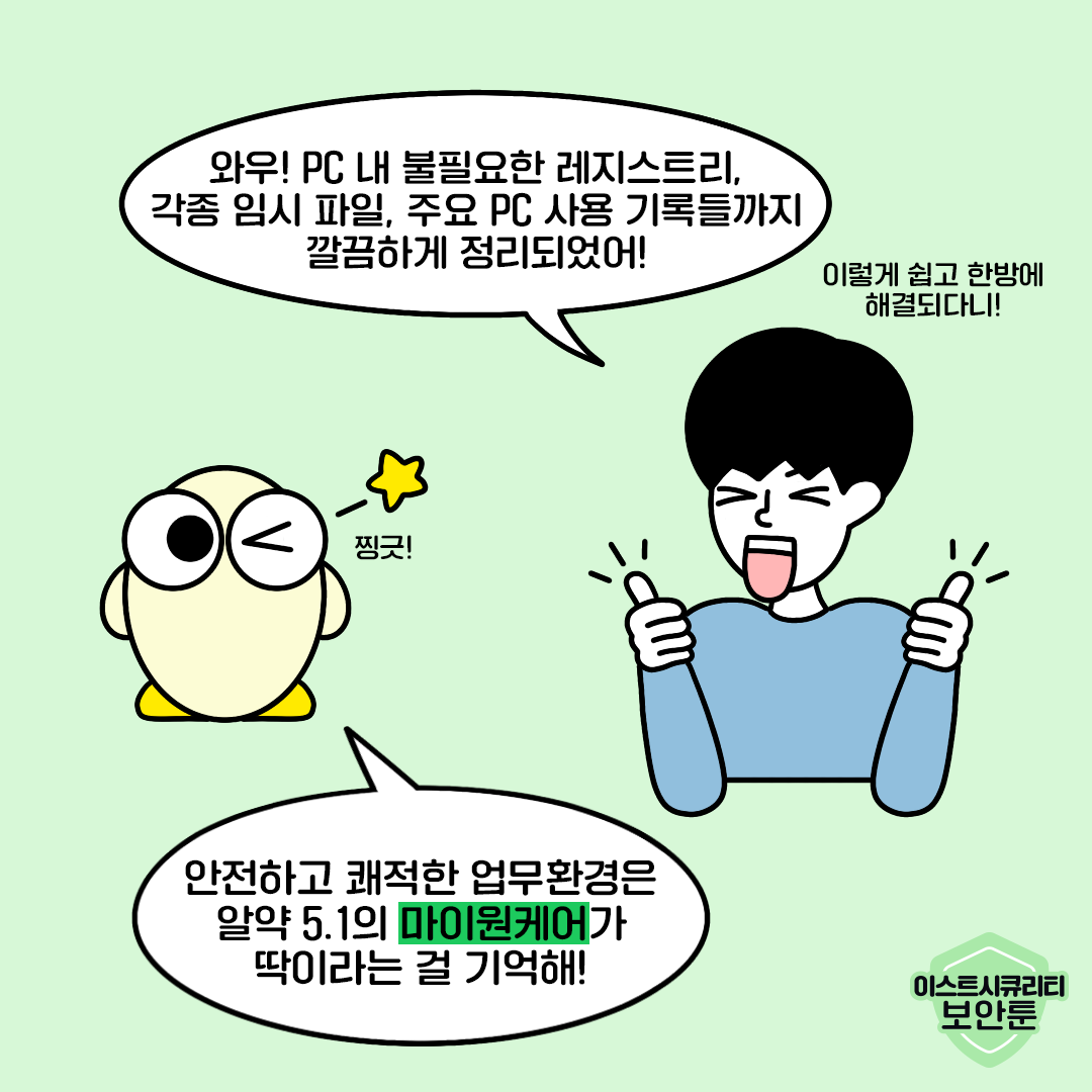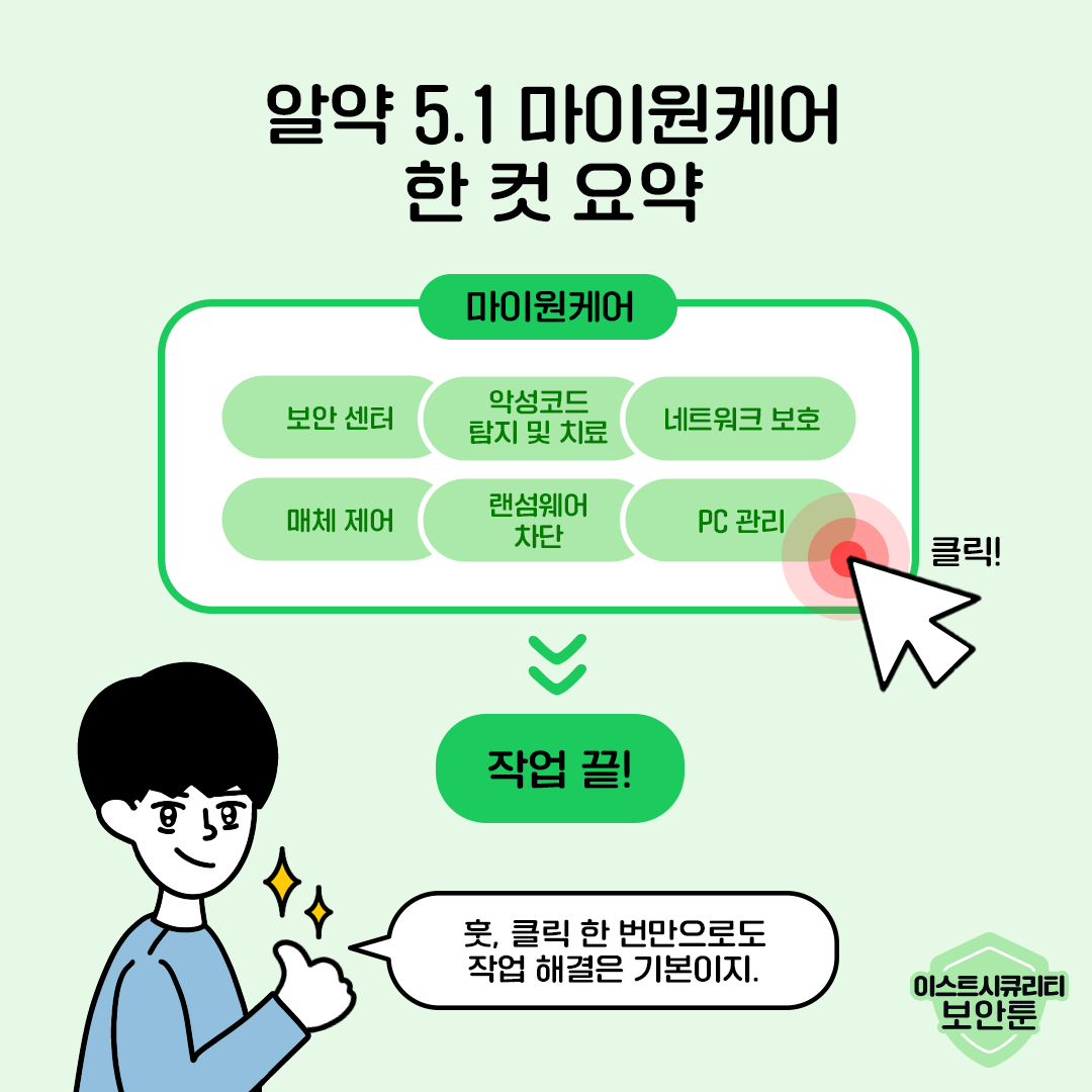 평소 백신을 사용하면서 검사 말고도 업데이트와 PC 정리까지, 한 번에 했으면 좋겠다고 생각해 보신 적 있으신가요? 이스트시큐리티 알약 5.1의 마이원케어는 클릭 한 번으로 편리하고 안전한 업무환경을 제공하고 있습니다. 더 자세한 상담이 필요하시다면 아래 링크에서 견적 문의를 남겨보세요! 📨
