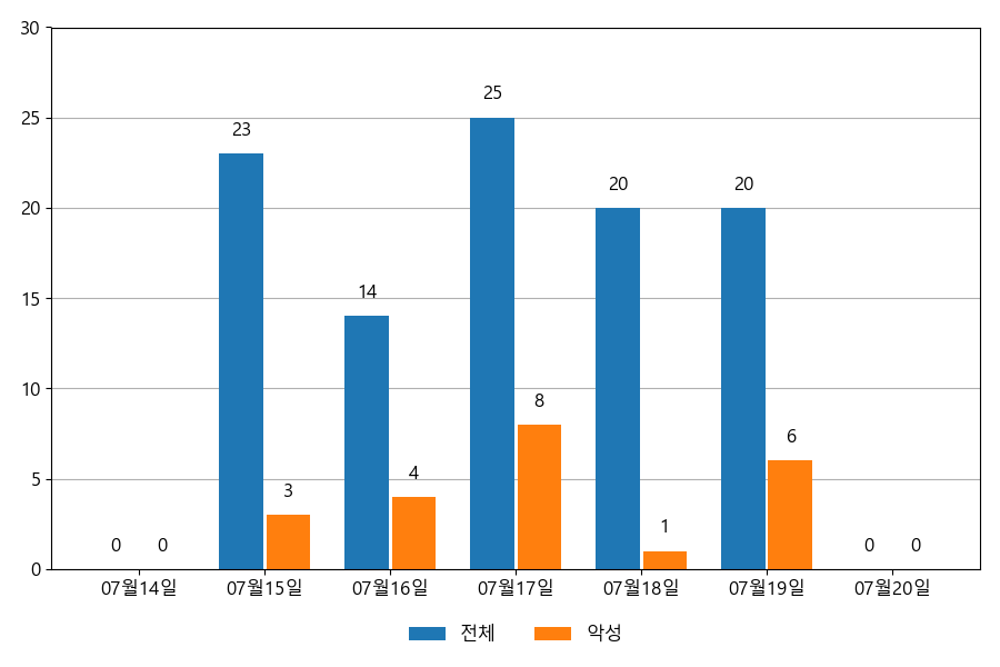 일일 유입량은 하루 최저 14건(악성 1건)에서 최대 25건(악성 8건)으로 일별 편차를 확인할 수 있습니다.