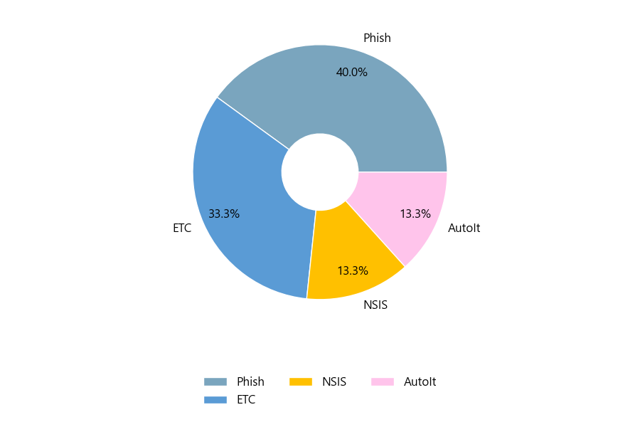 첨부파일은 ‘Phish’형태가 40.0%로 제일 큰 비중을 차지했고 뒤이어 ‘ETC’, ‘NSIS’가 각각 33.3%, 13.3%의 비중을 차지했습니다.