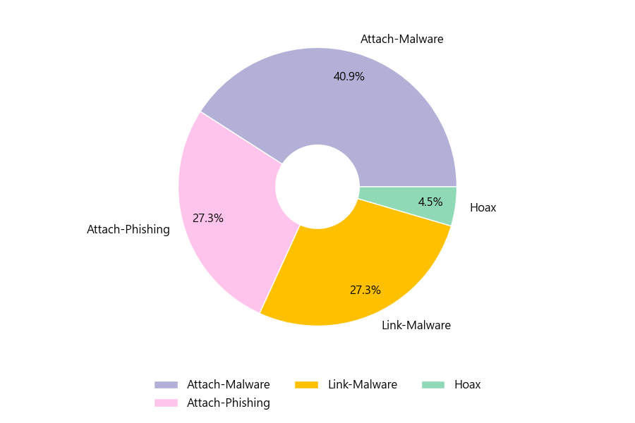 악성 이메일을 유형별로 살펴보면 22건 중 Attach-Malware형이 40.9%로 가장 많았고 뒤이어 Attach-Phishing형이 27.3%를 나타냈습니다.