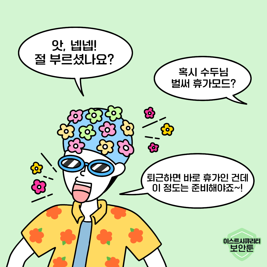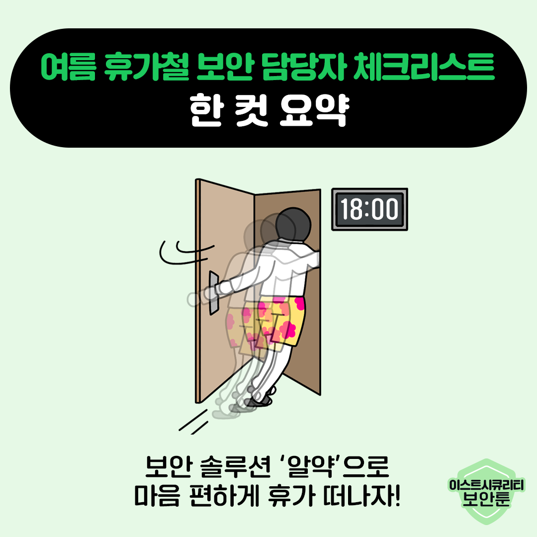 여름 휴가를 떠나기 전, 보안 대책은 마련해두셨나요? 마음 편히 휴가를 떠나지 못하는 보안 담당자를 위해 이스트시큐리티에서 휴가철 보안 체크리스트를 알려드립니다. 철저한 준비와 예방을 통해 안전한 여름 휴가를 보내시길 바라며, 더 자세한 상담이 필요하시다면 아래 링크에서 견적 문의를 남겨보세요!