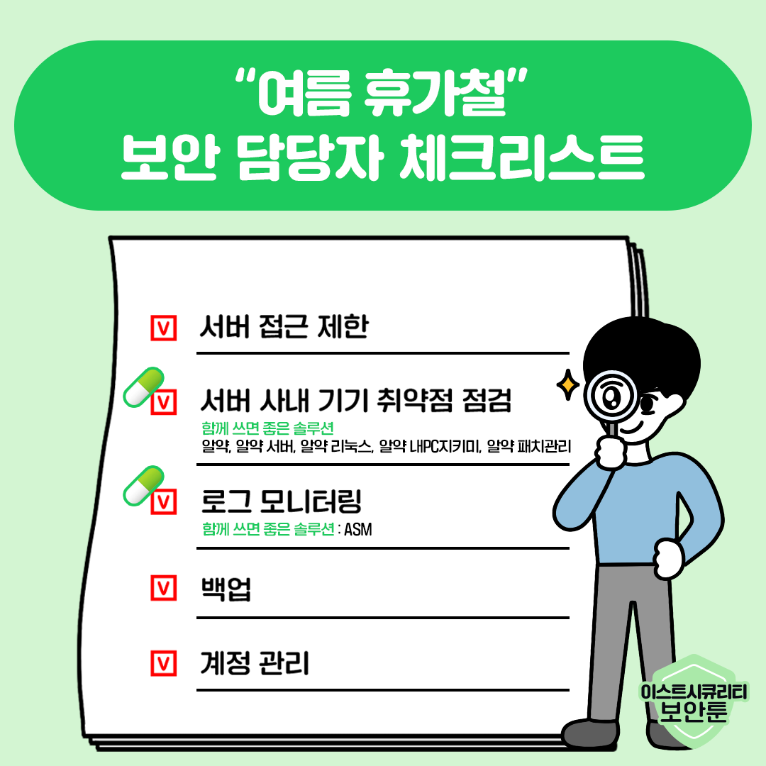 여름 휴가를 떠나기 전, 보안 대책은 마련해두셨나요? 마음 편히 휴가를 떠나지 못하는 보안 담당자를 위해 이스트시큐리티에서 휴가철 보안 체크리스트를 알려드립니다. 철저한 준비와 예방을 통해 안전한 여름 휴가를 보내시길 바라며, 더 자세한 상담이 필요하시다면 아래 링크에서 견적 문의를 남겨보세요!