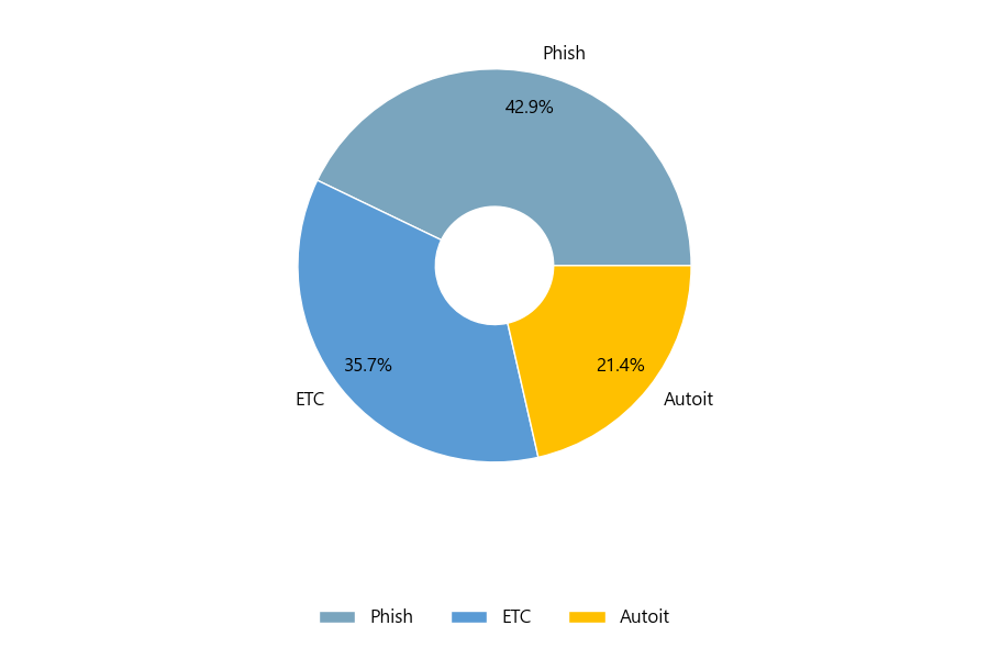 첨부파일은 ‘Phish’형태가 42.9%로 제일 큰 비중을 차지했고 뒤이어 ‘ETC’, ‘Autoit’가 각각 35.7%, 21.4%의 비중을 차지했습니다.
