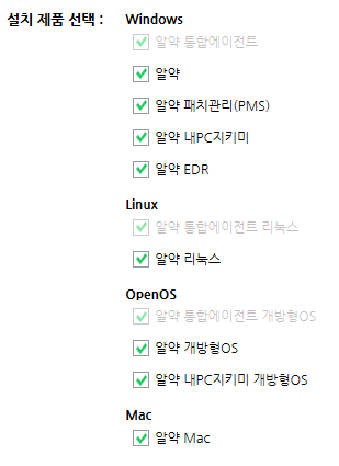 구매한 제품 중 사용자 PC에 설치할 제품을 선택합니다.