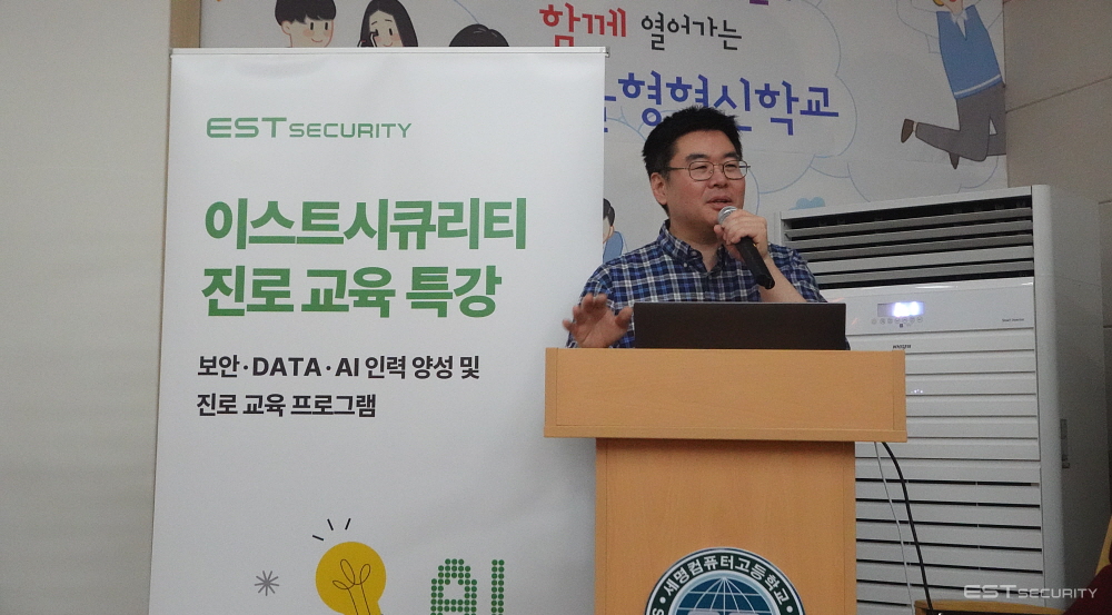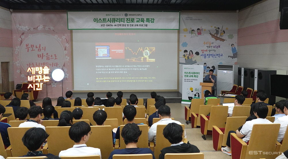 오늘은 이스트시큐리티가 사회공헌 프로그램의 일환으로 세명컴퓨터고등학교 인공지능소프트웨어과 학생 120명을 대상으로 진로 교육 특강을 진행하였다는 소식을 전해드립니다.