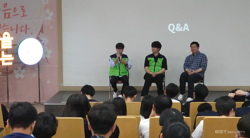 이스트시큐리티는 이번 사회공헌 프로그램에서 AI 전문가 김병훈 CTO의 특강을 진행했으며, 특성화고등학교 학생들의 눈높이에 맞추어 선배 개발자와의 대화도 진행하였습니다.