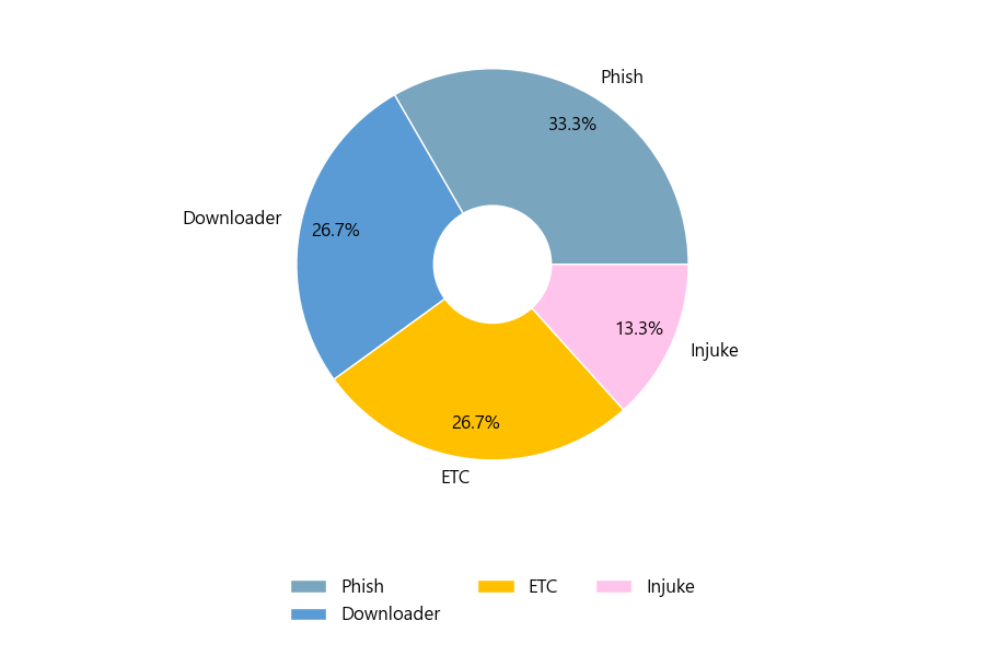 첨부파일은 ‘Phish’형태가 33.3%로 제일 큰 비중을 차지했고 뒤이어 ‘Downloader’, ‘ETC’가 각각 26.7%, 26.7%의 비중을 차지했습니다.