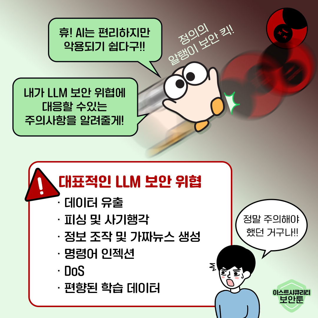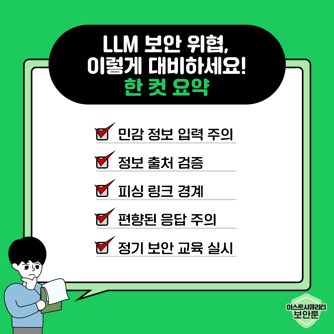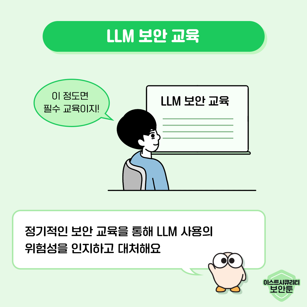 생성형 AI가 편리하다는 이유로 기밀 데이터 유출 위험을 간과하고 있지 않으신가요? 지금 바로 LLM을 통해 발생할 수 있는 보안 위협을 확인하고, 이스트시큐리티가 제공하는 LLM 사용 보안 수칙을 숙지하여 보다 안전하게 AI 사용 환경을 구축해보세요!