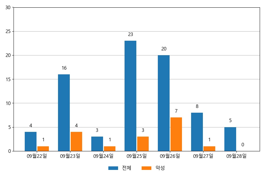 일일 유입량은 하루 최저 3건(악성 1건)에서 최대 23건(악성 7건)으로 일별 편차를 확인할 수 있습니다.