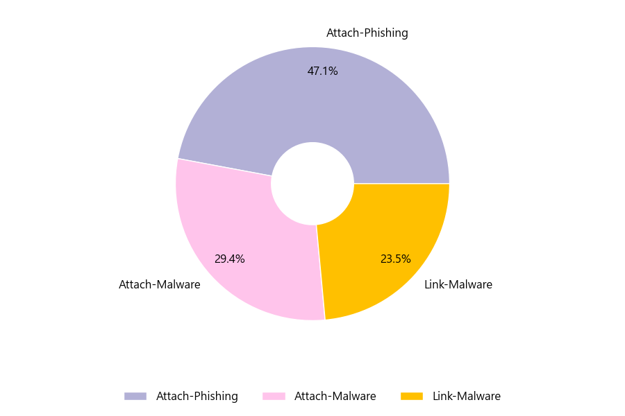 악성 이메일을 유형별로 살펴보면 17건 중 Attach-Phishing형이 47.1%로 가장 많았고 뒤이어 Attach-Malware형이 29.4%를 나타냈습니다.