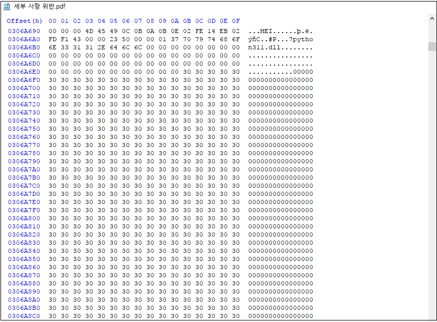 또한 코드 뒷부분에 의미 없는 더미 데이터를 추가하여 파일 사이즈를 대용량으로 늘렸으며, 이는 탐지 회피 및 코드 분석을 방해하려는 목적으로 판단됩니다.