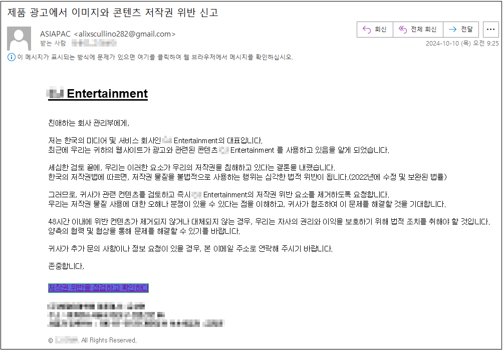 해당 메일은 ‘제품 광고에서 이미지와 콘텐츠 저작권 위반 신고’ 라는 제목으로 유포되고 있으며, 저작권 위반 요소를 제거해달라는 요청과 함께 저작권 침해에 대한 경고 메시지 내용으로 사용자에게 불안감을 유발하여 본문 내 저작권 위반 내용을 확인하기 위한 링크를 클릭 하도록 유도합니다.