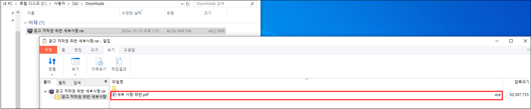 사용자가 본문 내 해당 링크를 클릭하게 되면 외부로 연결된 링크를 통해 ‘광고 저작권 위반 세부사항.rar’ 이라는 압축파일이 다운로드 되고, 해당 압축파일 내부에는 ‘세부 사항 위반’ 이라는 파일이 확인됩니다. 해당 파일은 실제 EXE 파일이나 PDF 아이콘 사용과 파일명에 긴 공백을 두어 EXE 확장자를 숨기는 고전적인 방법을 사용했습니다.