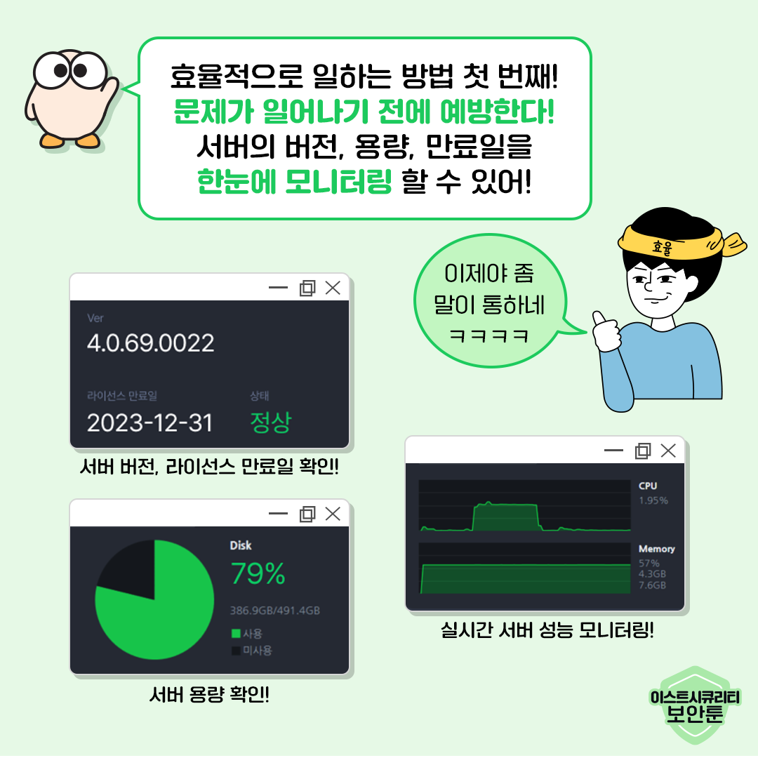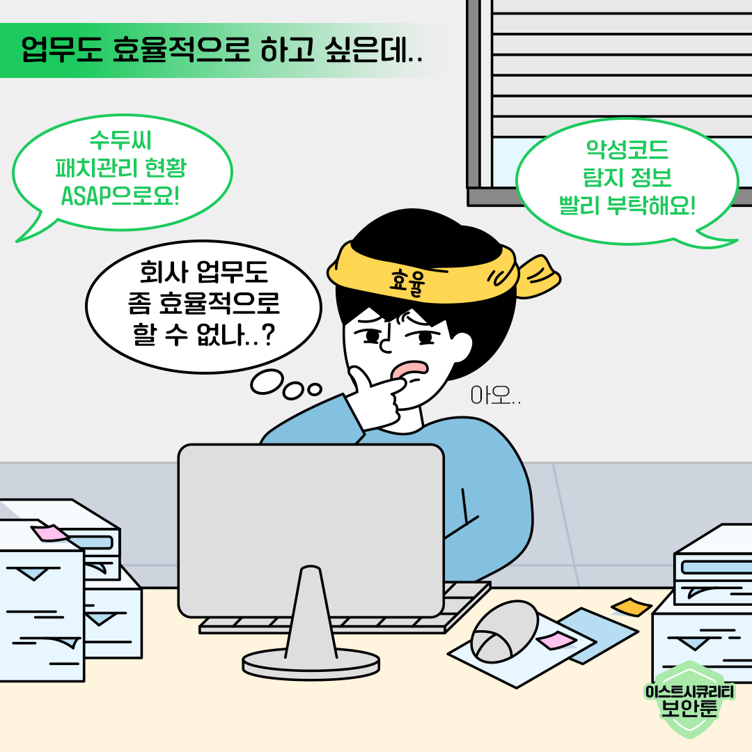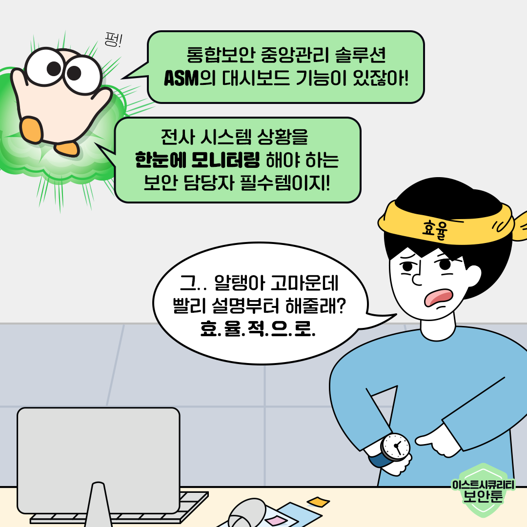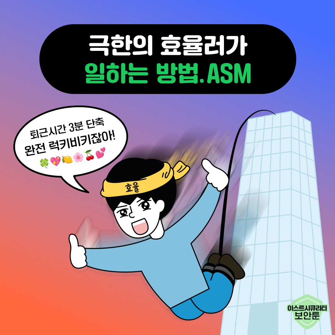 효율의 끝판왕인 당신, 회사 업무도 좀 효율적으로 하고 싶은데, 어떤 보안 솔루션을 도입해야 할지 막막하신가요? 이스트시큐리티의 ASM을 통해 회사 보안을 한눈에 모니터링하고 싶다면 아래 링크에서 견적 문의를 남겨보세요! 📨