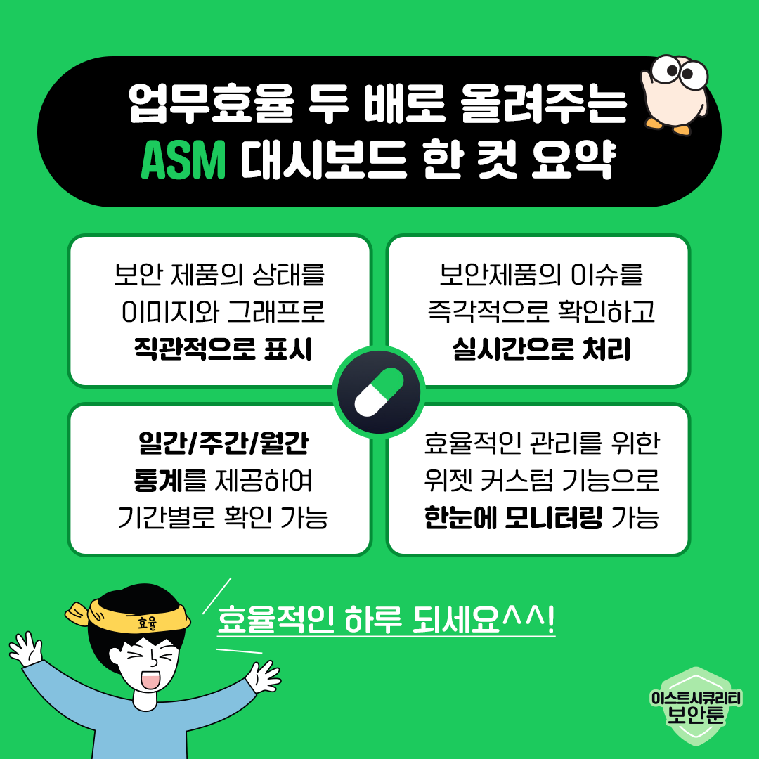 효율의 끝판왕인 당신, 회사 업무도 좀 효율적으로 하고 싶은데, 어떤 보안 솔루션을 도입해야 할지 막막하신가요? 이스트시큐리티의 ASM을 통해 회사 보안을 한눈에 모니터링하고 싶다면 아래 링크에서 견적 문의를 남겨보세요! 📨