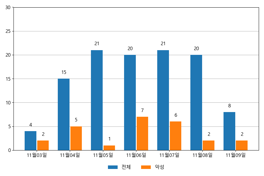 일일 유입량은 하루 최저 4건(악성 1건)에서 최대 21건(악성 7건)으로 일별 편차를 확인할 수 있습니다.