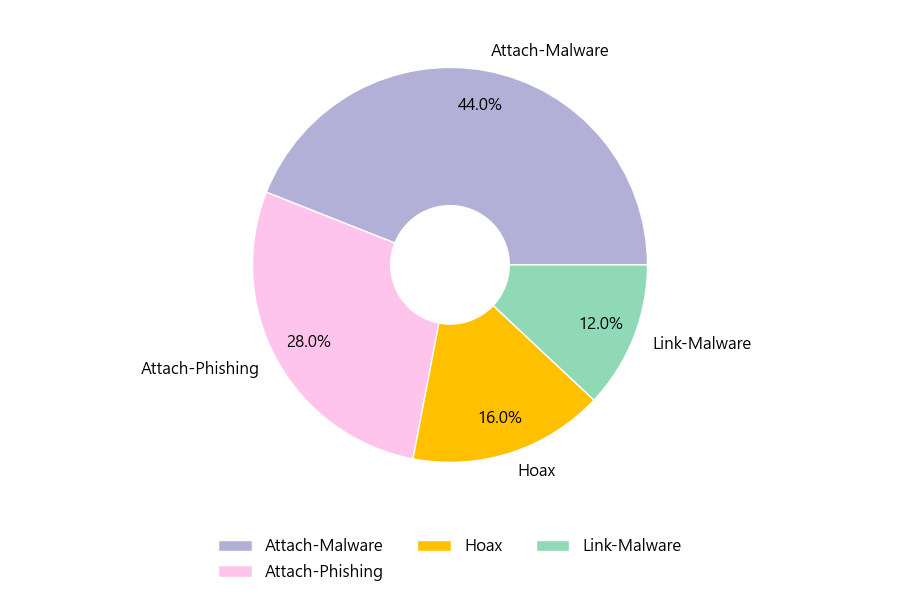 악성 이메일을 유형별로 살펴보면 25건 중 Attach-Malware형이 44.0%로 가장 많았고 뒤이어 Attach-Phishing형이 28.0%를 나타냈습니다.