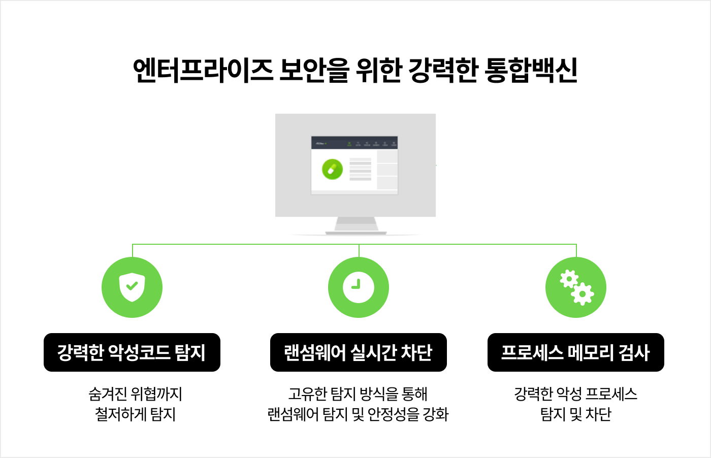 엔터프라이즈 보안을 위한 강력한 통합백신, 알약은 더 높은 수준의 탐지력과 강력한 악성코드 차단 기능을 제공하며, 기업의 데이터와 시스템을 실시간으로 빈틈없이 지켜줍니다.