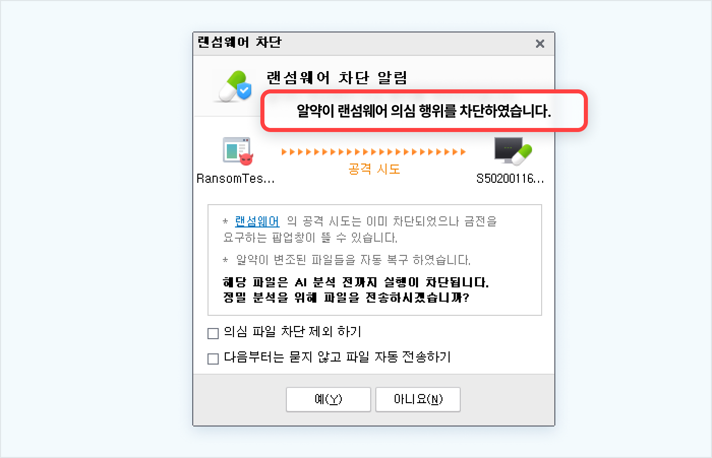 알약은 랜섬웨어 공격에 특화된 차단 기능을 갖추고 있습니다. 랜섬웨어 감염으로 인한 사용자 파일 암호화를 사전 차단하며, 감염 의심 파일을 수집하여 랜섬웨어 탐지 DB를 강화합니다.