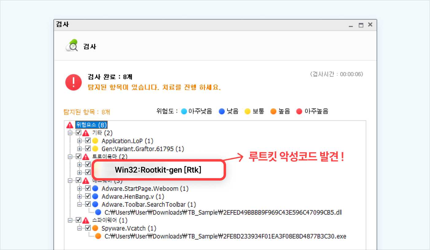 점점 고도화된 보안 위협 속에서 루트킷 악성코드와 같은 공격 도구들이 점점 널리 활용되고 있으며, 알약의 루트킷 악성코드 검사 기능은 악성코드 발견 시 신속한 대응과 악성코드 위협 분석으로 피해를 최소화하고자 합니다.