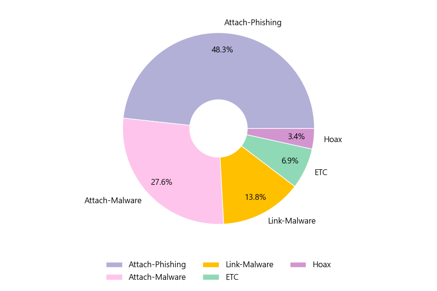 악성 이메일을 유형별로 살펴보면 29건 중 Attach-Phishing형이 48.3%로 가장 많았고 뒤이어 Attach-Malware형이 27.6%를 나타냈습니다.