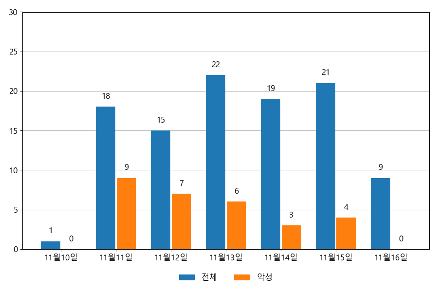 일일 유입량은 하루 최저 1건(악성 3건)에서 최대 22건(악성 9건)으로 일별 편차를 확인할 수 있습니다.