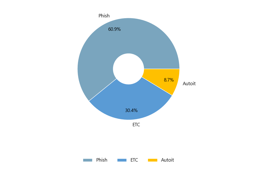 첨부파일은 ‘Phish’형태가 60.9%로 제일 큰 비중을 차지했고 뒤이어 ‘ETC’, ‘Autoit’가 각각 30.4%, 8.7%의 비중을 차지했습니다.