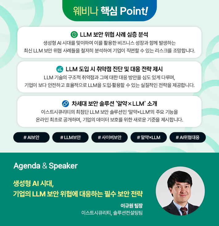 이번 웨비나에 꼭 참석하셔서 기업의 안전한 LLM 활용을 위한 보안 인사이트와 이스트시큐리티만의 차별화된 LLM 보안 솔루션, '알약xLLM'의 기능과 특징을 꼭 확인해 보시길 바랍니다.