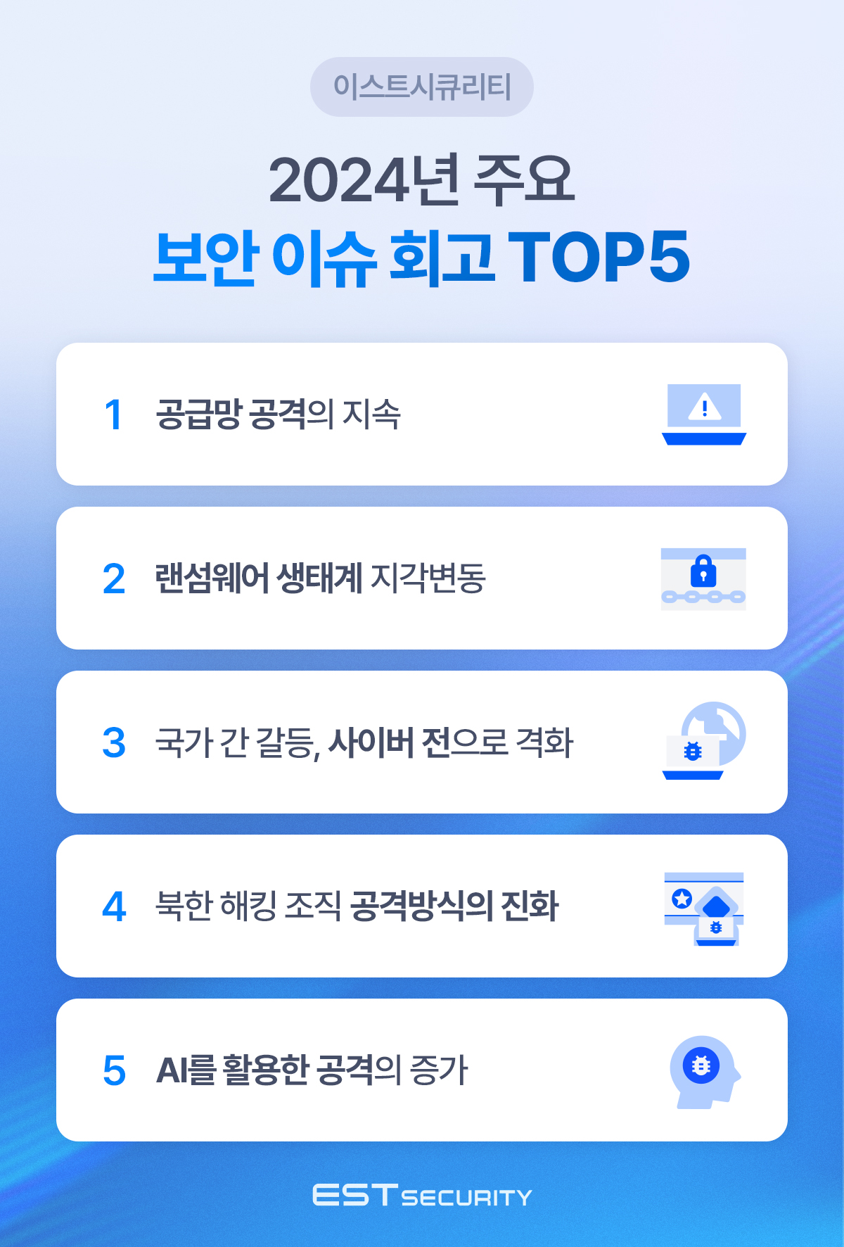 이스트시큐리티는 2024년에 발생했던 보안 위협들을 정리해보고, 2025년 보안 위협들을 전망해 보았습니다.