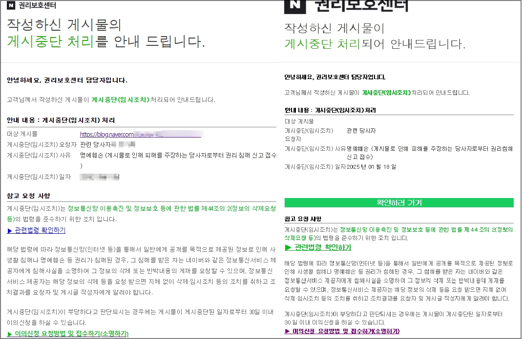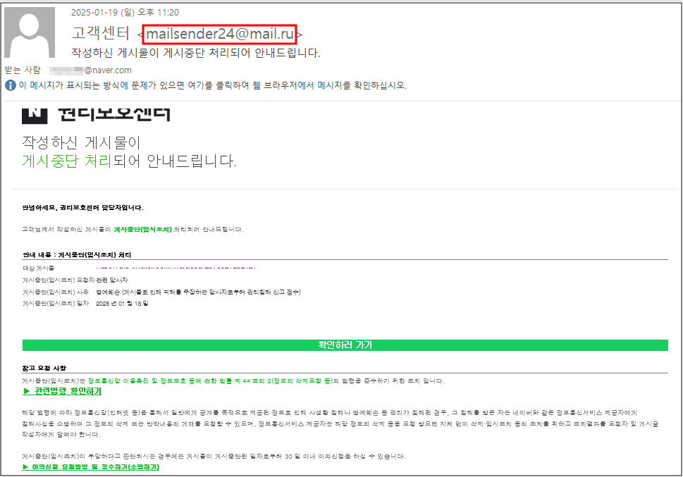 해당 피싱 메일은 ‘작성하신 게시물이 게시중단 처리되어 안내드립니다.’ 라는 제목으로 유포되고 있으며, 실제 공식사이트에서 게시 중단 요청을 접수 받아 진행하는 게시중단 처리 안내 메일과 매우 흡사하게 제작되었습니다.